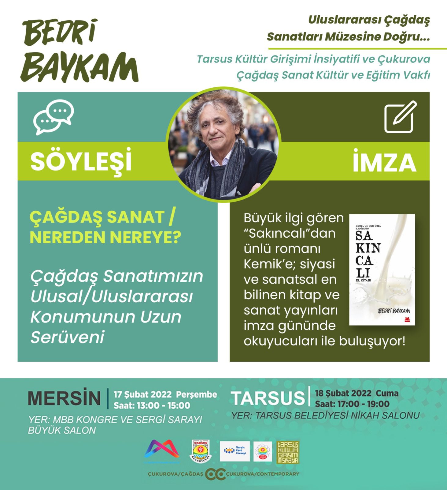 Sanatçı, yazar, Uluslararası Plastik Sanat Dernekleri Dünya Başkanı Bedri Baykam, “Çağdaş Sanatımızın Uluslararası Serüveni” başlıklı konferansı ve yeni kitabı “Sakıncalı”nın imza günü için Tarsus ve Mersin’e geliyor. Tarsus Kültür Girişimi İnisiyatifi ve Çukurova Çağdaş Sanat Kültür ve Eğitim Vakfı, kurucusu ve Mütevelli Heyet Üyesi olan Baykam, Tarsus merkezli, uluslararası standartlarda bir çağdaş sanatlar müzesi kurma amacını gerçekleştirmek üzere, 2.500 kişinin destek verdiği yerel vakıf ve derneklerle de bir araya gelecek.