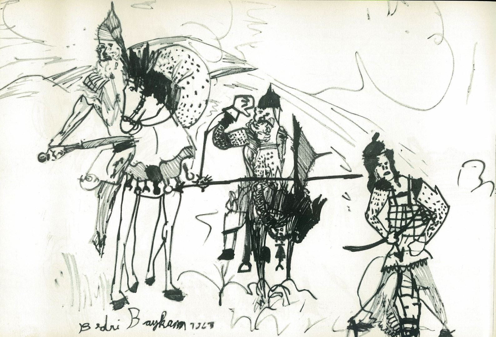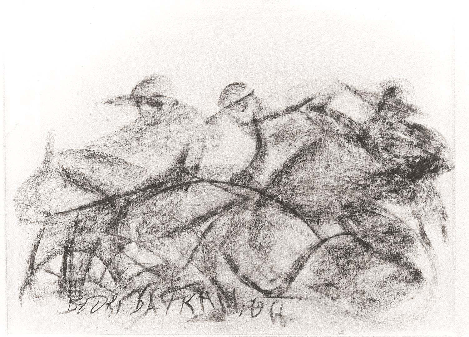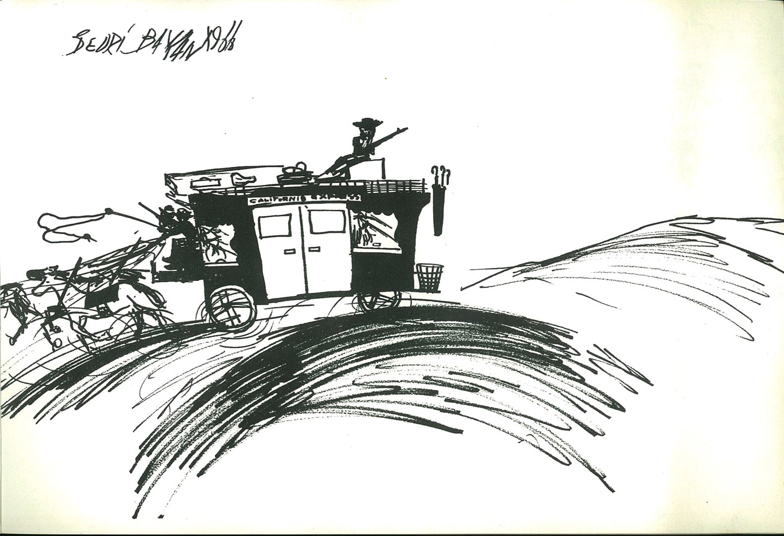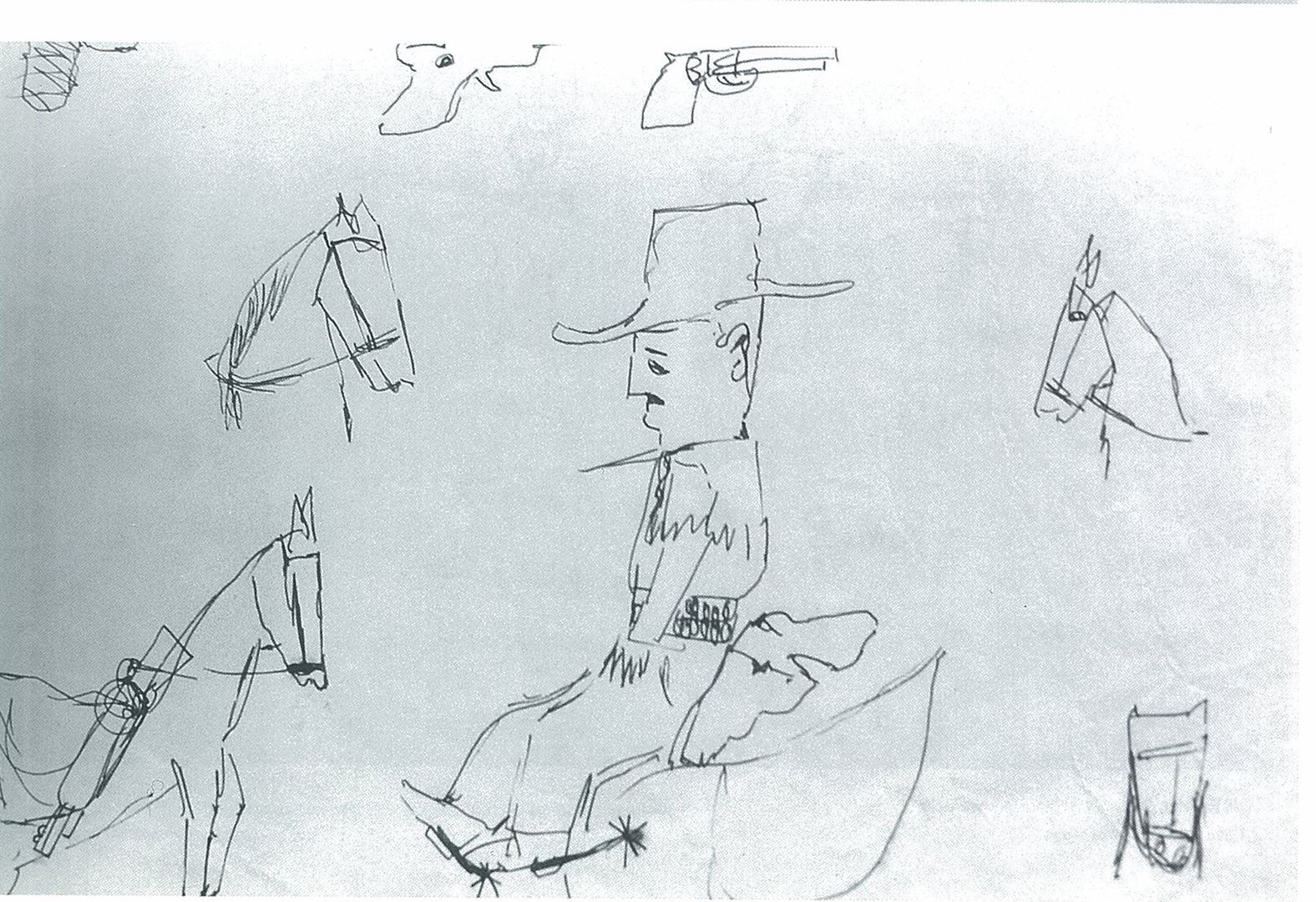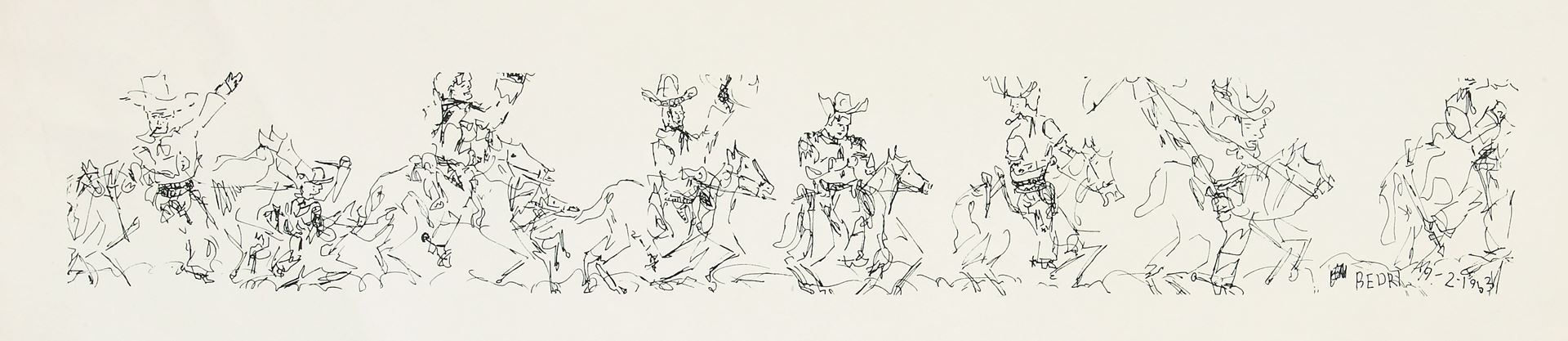 Mostly black and white, some color drawings of cowboys, Indians, war scenes, spaceship, houses, jockeys, some color abstractions, done with pencil, charcoal, china ink on paper. These works have made the artist's initial debut as an international "Wunderkind" in the 60's with numerous shows in international art centers between 1963-1972.