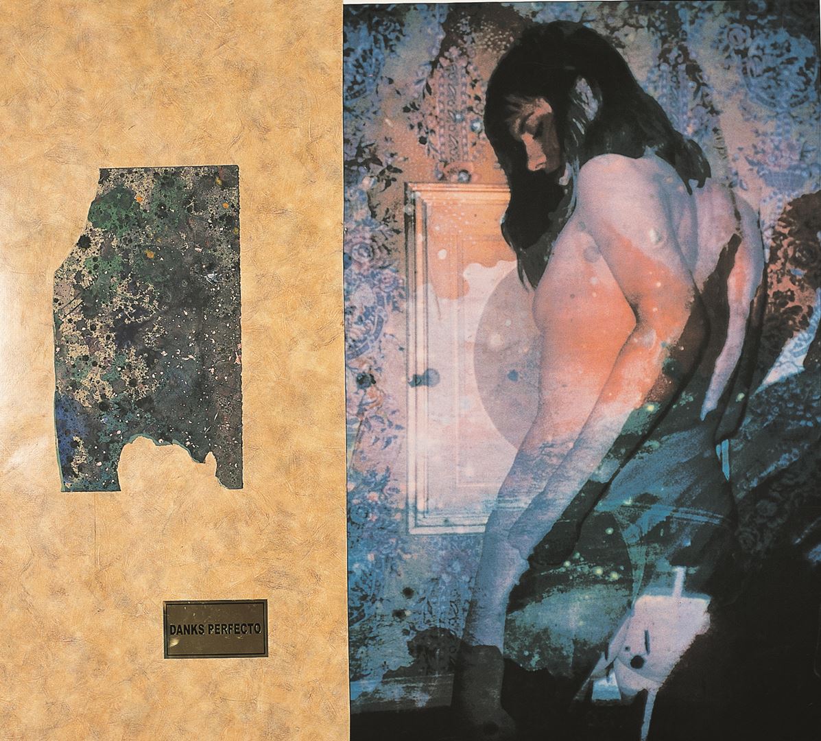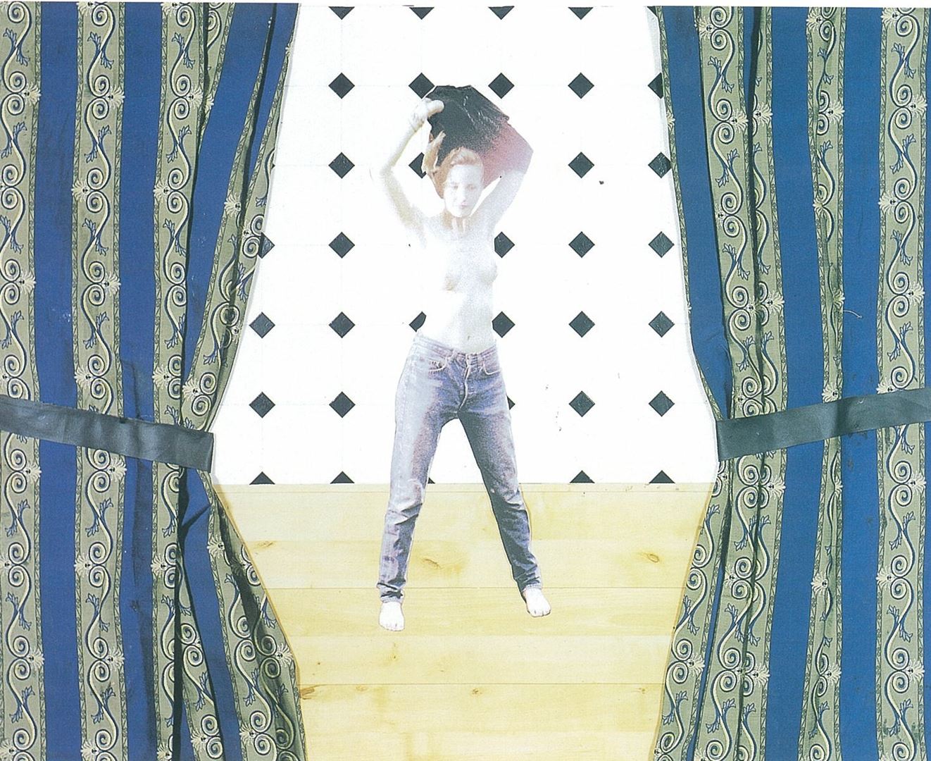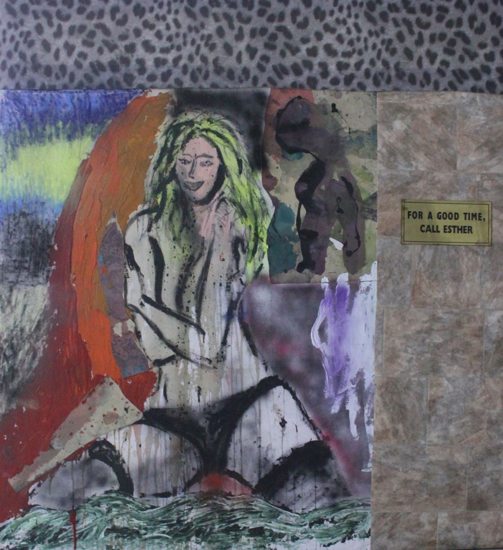 The images either painted or printed by ink-jet processed canvas are coming together with materials such as tissues, metal plates, plastic floor coatings, papers and synthetic grass, in some multi-material collages.