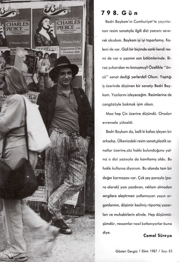 Modern ve Çağdaş sanata kısa, genel bir bakış, Post-Modernizm ve Yeni-Dışavurumculuğun doğumuna ilişkin denemeler. Ayrıca Amerikan sanat dünyasına ilişkin görüşler ve Baykam'ın 1980'lerde ABD'deki sanatsal ve özel yaşamından yansımalar. San Francisco'da dağıttığı "Modern Sanat Tarihi, Batının bir oldu-bittisi" isimli manifesto ve uzantıları...