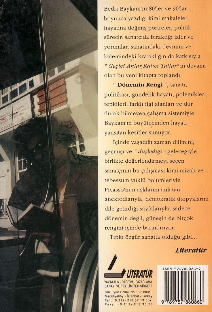 Bedri Baykam'ın 80'ler ve 90'lar boyunca yazdığı kimi makaleler, hayatına değmiş portreler, politik sürecin sanatına bıraktığı izler ve yorumlar, sanatındaki devinim ve kalemindeki kıvraklığın da katkısıyla Geçici Anlar, Kalıcı Tatlar'ın devamı olan bu yeni kitapta toplandı. Dönemin Rengi, sanatı, politikası, gündelik hayatı, polemikleri, tepkileri, farklı ilgi alanları ve durdurak bilmeyen çalışma sistemiyle Baykam'ın, büyütecinden hayatı yansıtan kesitler sunuyor. İçinde yaşadığı zaman dilimini; geçmişi ve 'düşlediği' geleceğiyle birlikte değerlendirmeyi seçen sanatçının bu çalışması kimi mizah ve tebessüm yüklü bölümleriyle Picasso'nun aşklarını anlatan anekdotlarıyla, demokratik ütopyalarını dile getirdiği sayfalarıyla, sadece dönemin değil, güneşin de birçok rengini içinde barındırıyor. Tıpkı özgür sanatta olduğu gibi...
