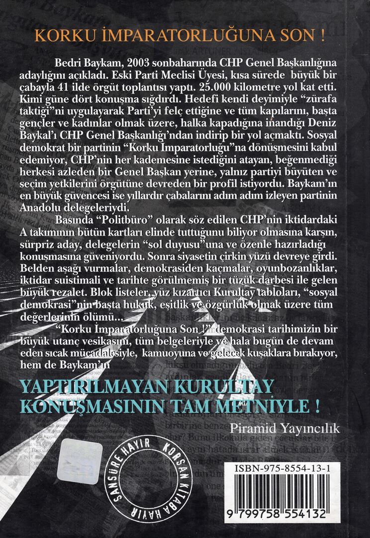 “Korku İmparatorluğuna Son” demokrasi tarihimizin bir büyük utanç vesikasını tüm belgeleriyle ve hala bugün de devam eden sıcak mücadelesiyle kamuoyuna ve gelecek kuşaklara bırakıyor, hem de Baykam’ın YAPTIRILMAYAN KURULTAY KONUŞMASININ TAM METNİYLE!