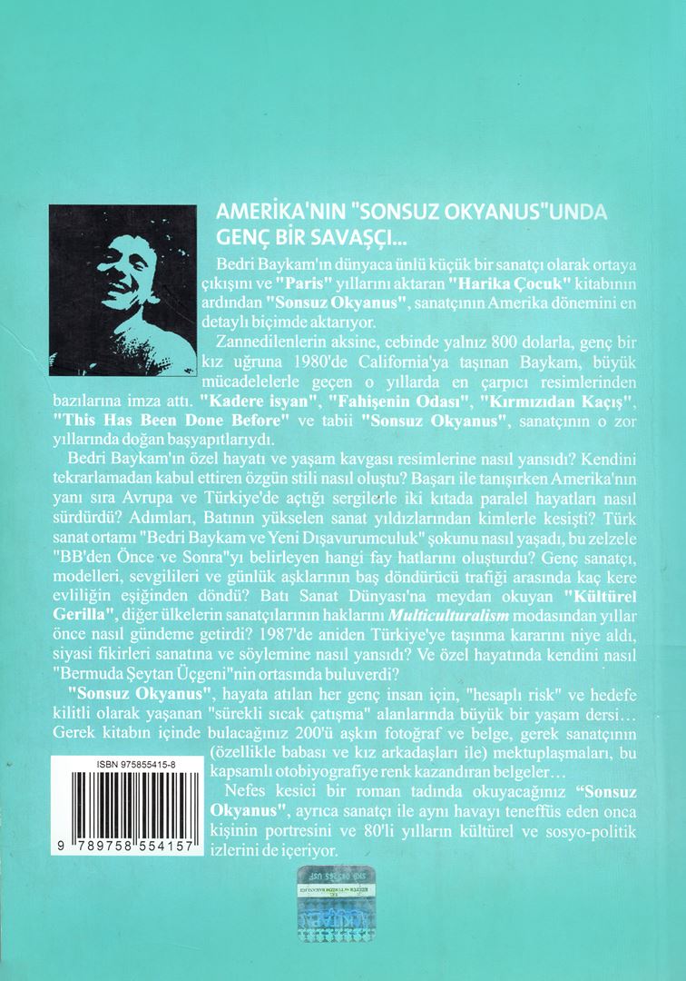 Bedri Baykam’ın dünyaca ünlü küçük bir sanatçı olarak ortaya çıkışını ve “Paris” yıllarını içeren Harika Çocuk kitabının ardından Sonsuz Okyanus, sanatçının Amerika dönemini en detaylı biçimde okuyucularla paylaşıyor. Zannedilenlerin aksine, cebinde yalnız 800 Dolar’la, genç bir kız uğruna 1980’de California’ya taşınan Baykam’ın, özel hayatı ve yaşam kavgası resimlerine nasıl yansıdı? Kendini tekrarlamadan kabul ettiren özgün stili nasıl oluştu? Başarı ile tanışırken Amerika’nın yanı sıra Avrupa ve Türkiye’de açtığı sergilerle iki kıtada paralel hayatları nasıl sürdürdü? Adımları, Batının yükselen sanat yıldızlarından kimlerle kesişti? Türk sanat ortamı “Bedri Baykam ve Yeni Dışavurumculuk” şokunu nasıl yaşadı? Genç sanatçı, modelleri, sevgilileri ve günlük aşklarının baş döndürücü trafiği arasında kaç kere evliliğin eşiğinden döndü? Batı Sanat Dünyası’na meydan okuyan “Kültürel Gerilla”, diğer ülkelerin sanatçılarının haklarını Multiculturalism modasından yıllar önce nasıl gündeme getirdi? 1987’de aniden Türkiye’ye taşınma kararını niye aldı, siyasi fikirleri sanatına ve söylemine nasıl yansıdı? Ve özel hayatında kendini nasıl “Bermuda Şeytan Üçgeni”nin ortasında buluverdi? Sonsuz Okyanus, hayata atılan her genç insan için, “hesaplı risk” ve hedefe kilitli olarak yaşanan “sürekli sıcak çatışma” alanlarında büyük bir yaşam dersi… Gerek kitabın içinde bulacağınız 200’ü aşkın fotoğraf ve belge, gerek sanatçının (özellikle babası ve kız arkadaşları ile) mektuplaşmaları, bu kapsamlı otobiyografiye renk kazandıran belgeler…