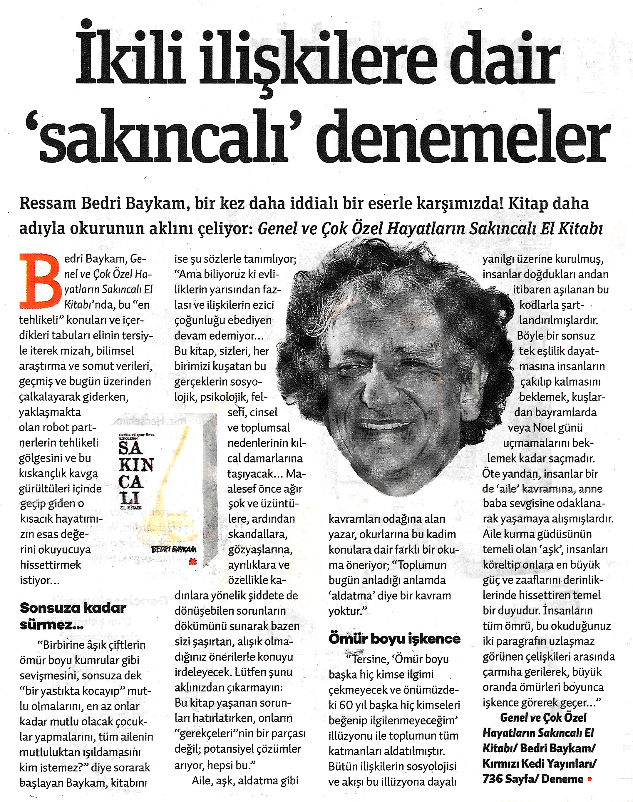 Ressam Bedri Baykam, bir kez daha iddialı bir eserle karşımızda! Kitap daha adıyla okurunun aklını çeliyor: Genel ve Çok Özel Hayatların Sakıncalı El Kitabı
